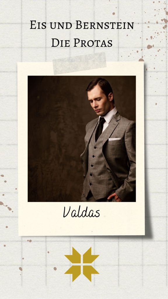 1981, dem Beginn der Eis und Bernstein-Saga, hat es Valdas weit gebracht: Er ist Direktor des Kombinats Elektronika in Vilnius. Durch seine Heirat mit Rūta (Sternenstürmer lässt grüßen), die wiederum aus einer einflussreichen Familie stammt, hat er sich in der Nomenklatura etabliert. Allerdings ist er abhängig vom Wohlwollen ihres Vaters, dem machtgierigen wie niederträchtigen Vytautas Šedvila – Pranas‘ Erzfeind seit den 1940er Jahren.