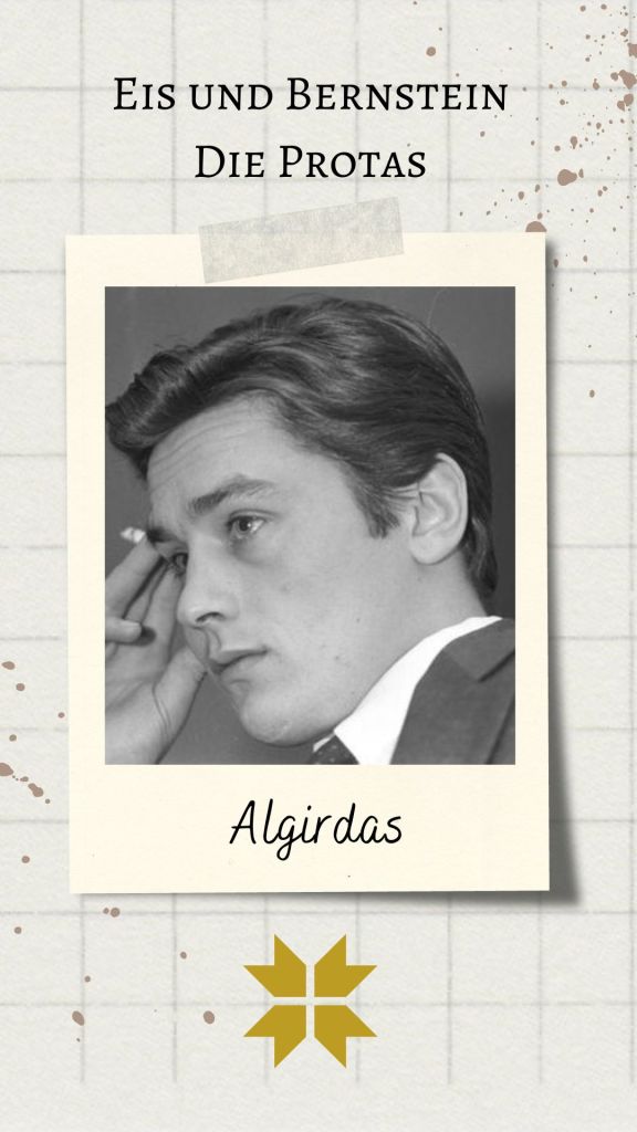 Das Trope vom voraussehenden, selbstlosen und stets moralisch lupenreinen Helden ist ungefähr so labbrig wie Pommes vom Vortag. Das wusste ich bereits 1991, als ich meinen allerersten Protagonisten schuf: Algirdas Montvila. Hochgewachsen und stattlich, mit kastanienfarbenem Haar und leicht schrägen blauen Augen war er der Held meiner Jugend. Und hat mit seiner kühlen Fassade einerseits und dem breiten Grinsen nichts von seiner Strahlkraft verloren. Darum gehört Algirdas zur A-Riege von „Eis und Bernstein“. Mit ihm möchte ich realistisch eine Biografie beschreiben, wie es sie in der Sowjetunion oder der DDR gab. Er ist kein Draufgänger, dafür ein wohlüberlegter Akteur, der zur richtigen Zeit am richtigen Ort war und die Geschicke leitete. Also ist es für ihn kein Widerspruch, Kommunist, Heide und Katholik zugleich zu sein.